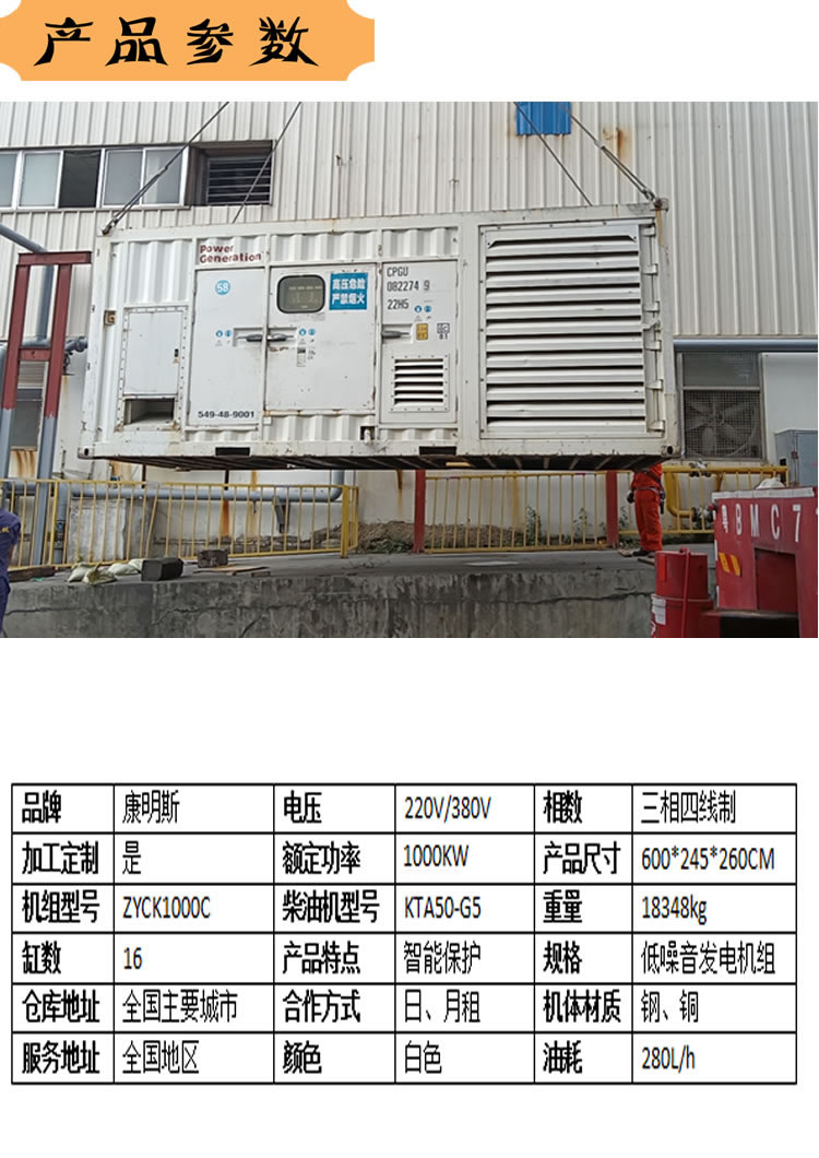 公司為客戶供應(yīng)有多種型號(hào)的康明斯發(fā)電機(jī)組,可以根據(jù)客戶自身用電需求使用相應(yīng)功率的發(fā)電機(jī)組供電。公司提供的功率小到50KW,大到1600KW的功率均有供應(yīng)。在這我公司就簡單的用1000KW的康明斯發(fā)電機(jī)組為例,簡單介紹一下相關(guān)參數(shù)。